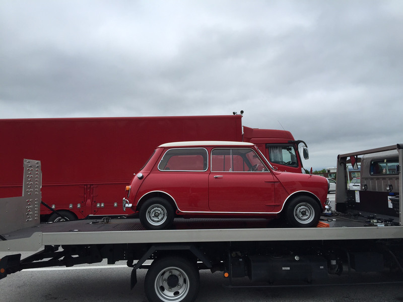 天気もよく青空とグリーンに赤いミニが映えますね。