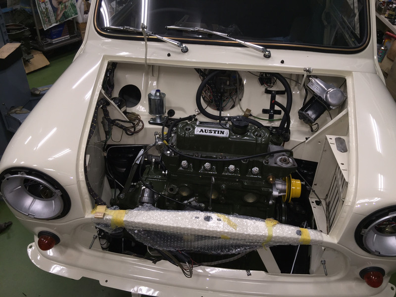 エンジンも載り、あとは補器類を取り付ければエンジンルームは完了となります。それぞれの部品を磨き、ボルトやナットに跡が残らないように工具も選んで組み付けております。