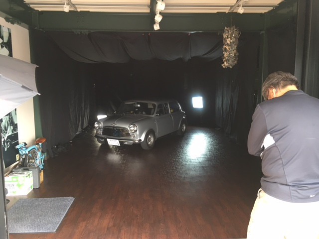 いやいや、簡易的にしてはしっかりとスタジオ風に仕立て店舗内で撮影中。